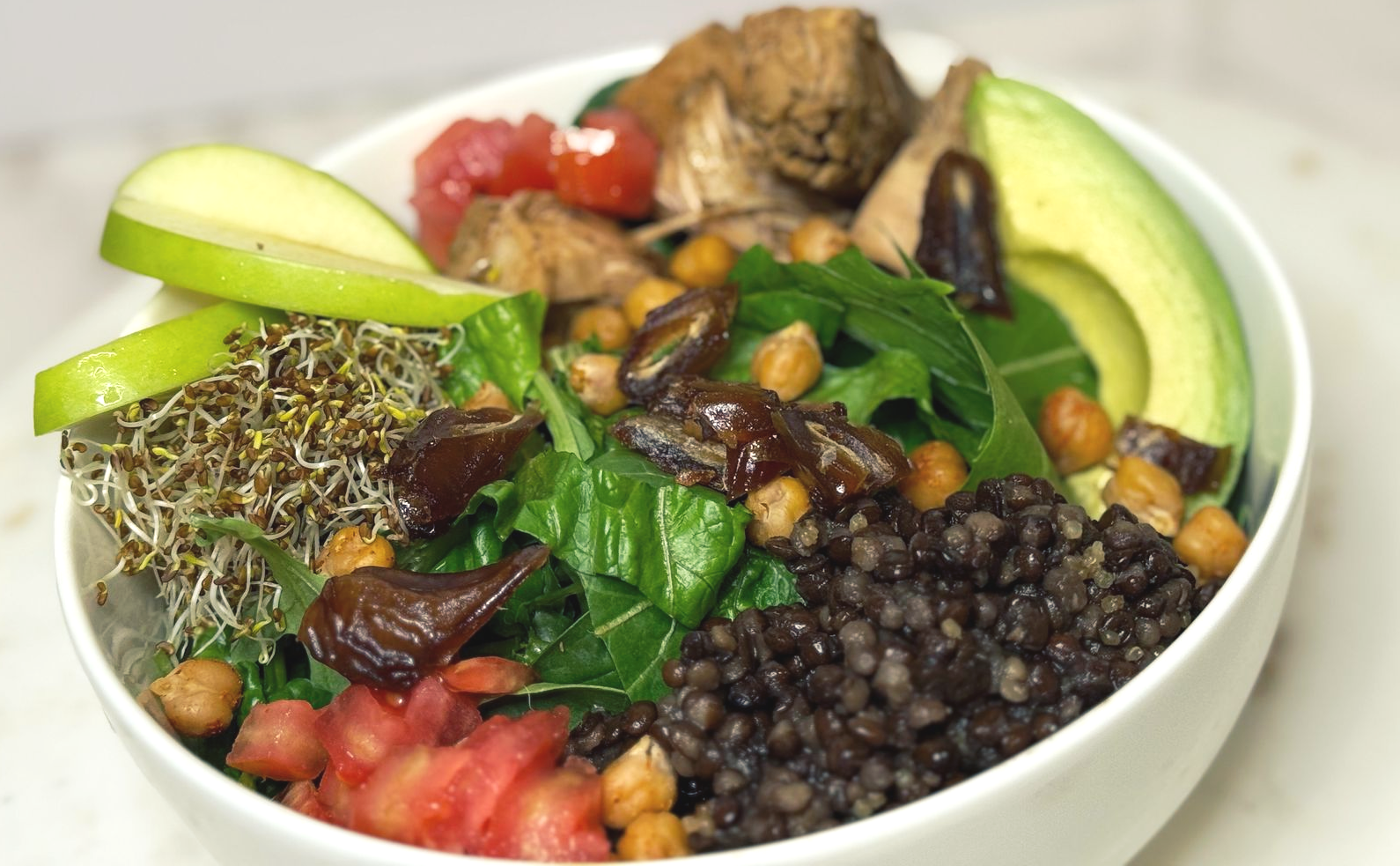 Romaine, spinach, arugula, dandelion greens, mushrooms, black lentils, jackfruit, green apple, avocado, dates, pumpkin seeds, scallions, tomatoes, alfalfa sprouts, chickpeas.